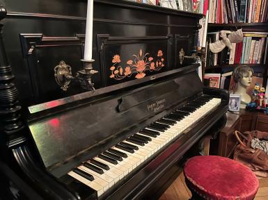 Jugendstil Klavier mit Intarsien und Kerzenleuchtern