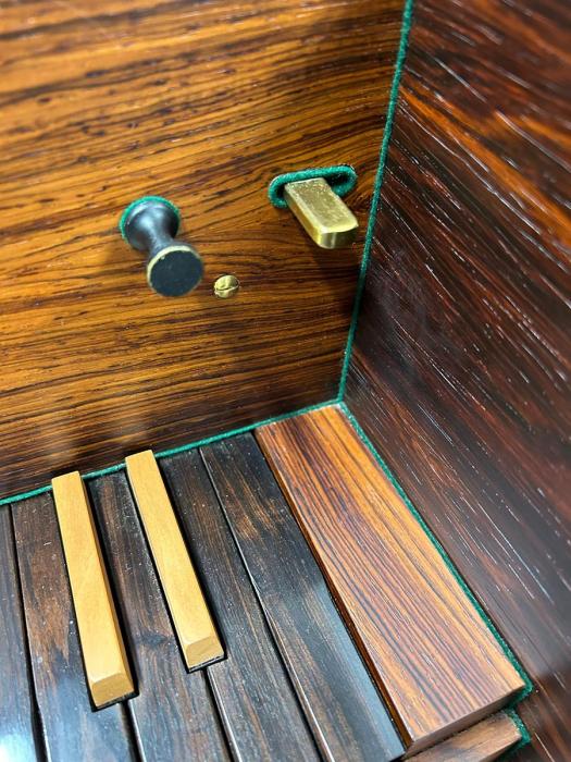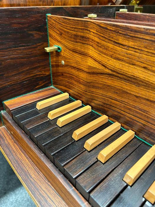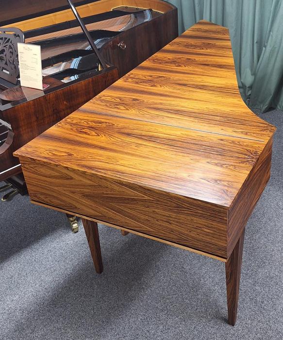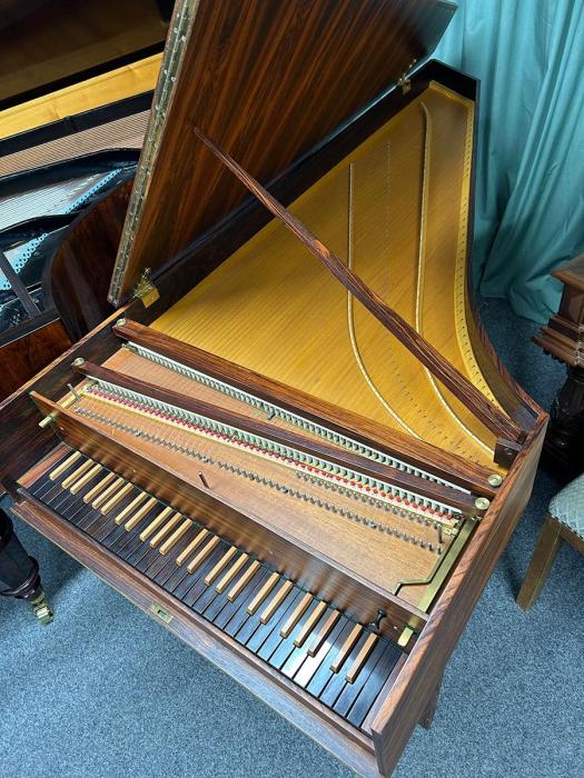 Dieses einmanualige Cembalo nach historischer Bauweise hat einen Tonumfang von A tief1 bis f³, ein 2 Saiten Register 4" und 8" mit Lautenzug. Es hat Kunststoff Springer und Delrin Kiele. Das Cembalo hat ein 3 Saiten Register, 1x 4" und 2x 8"bei 8" ist ein Register grundtöniger und das Andere obertöniger.