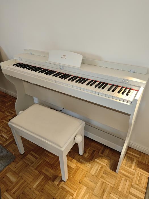 Verkaufen hier ein weißes E-Piano der Marke Mustar mit Klavierbank.