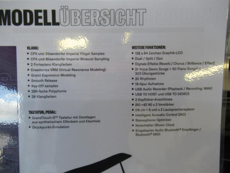 Ein elegantes Schmückstück fürs Wohnzimmer mit aufstellbarem Deckel in der prämierten YAMAHA-Qualität. Mit GH3X-Hammermechanik mit Gewichtsverteilung. Neues Bediencenter links mit Display zur leichteren Bedienung der vielfältigen Möglichkeiten. YAMAHA- und BÖSENDORFER-Flügelklänge sowie weitere hochwertige Klangfarben. Recorder, USB, usw. Technische Daten auf unserer Homepage!