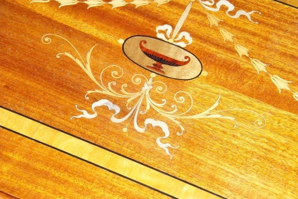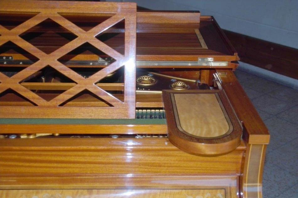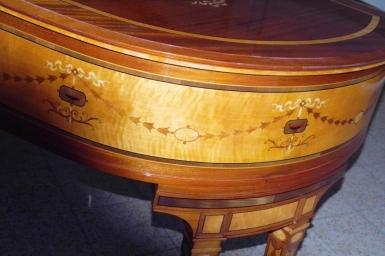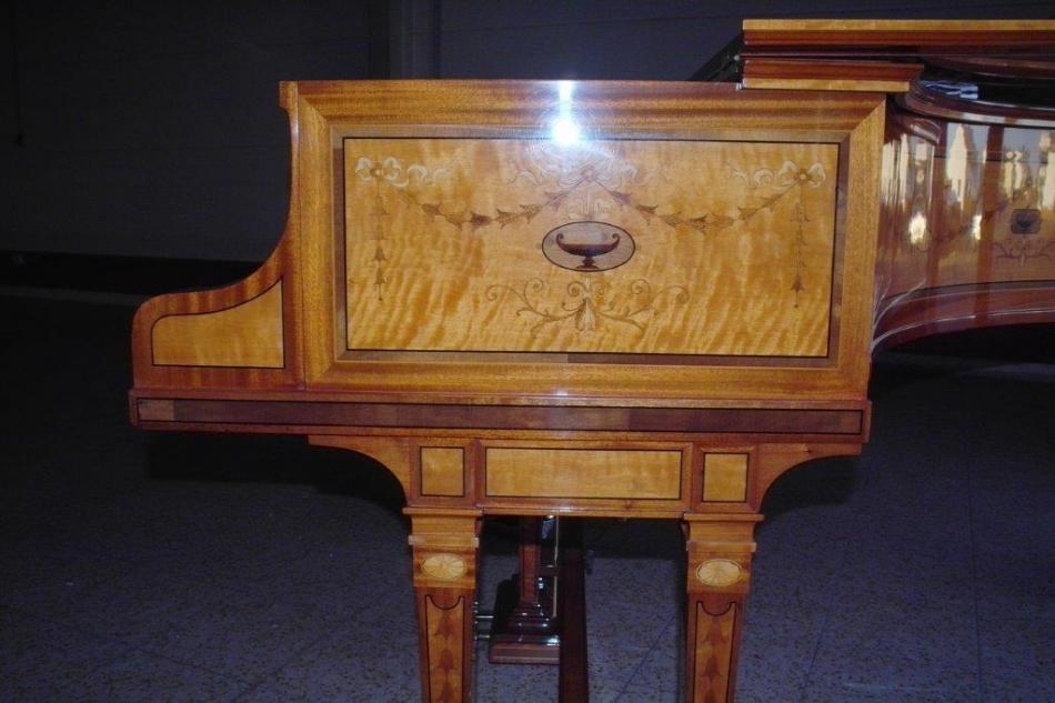 Dieses wirklich prachtvolle und mit viel Liebe entworfene und von Kunsthandwerkern hergestellte Sondermodell ist schlicht eine Pracht mit seinen vielfältigen Einlegearbeiten.Herrliche kunstvoll verarbeitete Hölzer machen den Flügel zu einer einmaligen Zierde.