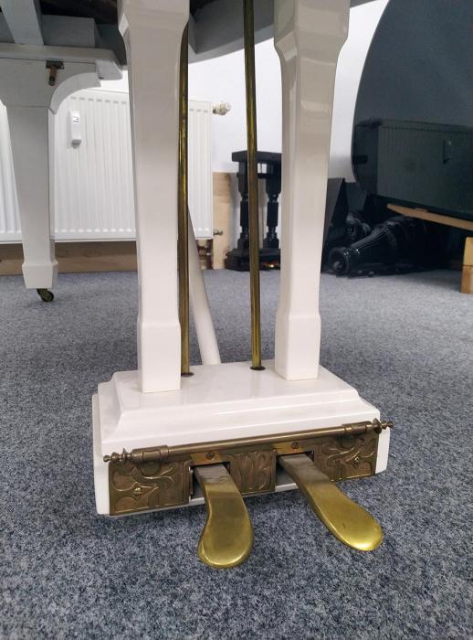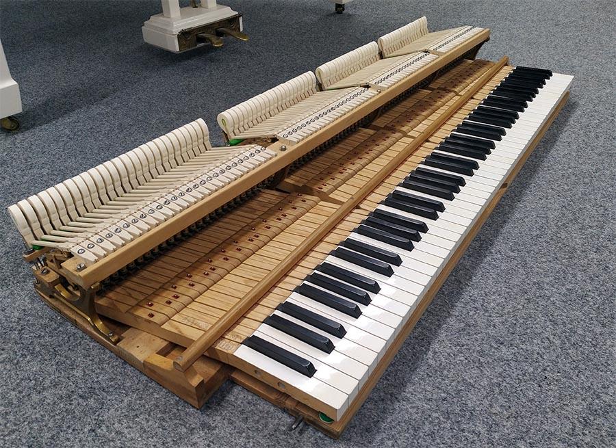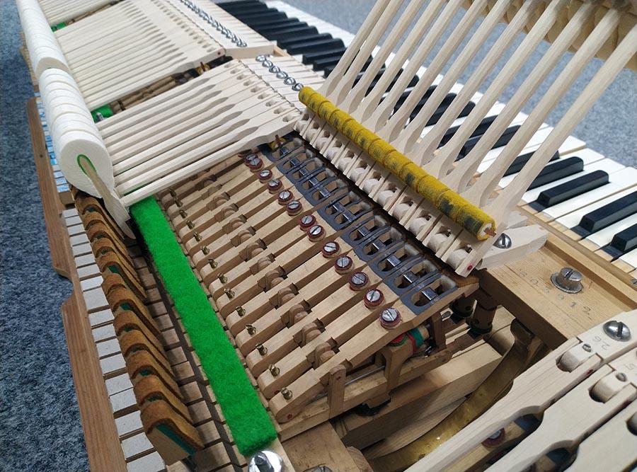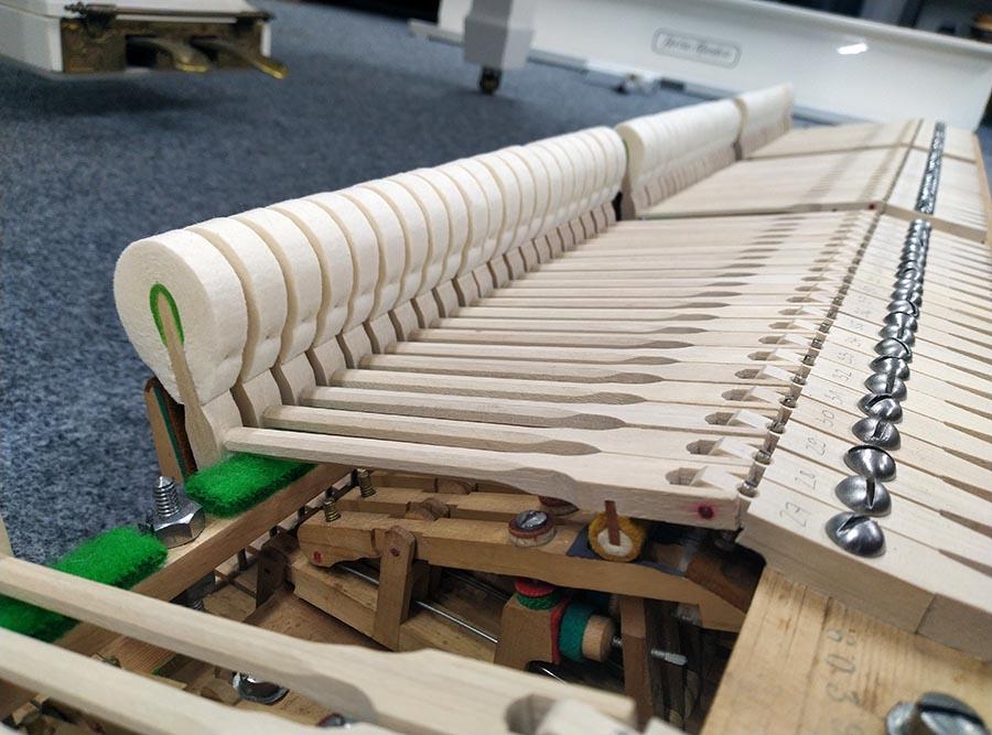 Ebenso bekam der Flügel neue Hammerköpfe und Stiele. Die Klaviaturrahmenfilze wurden ausgetauscht, sowie die Tastengarnierungen.