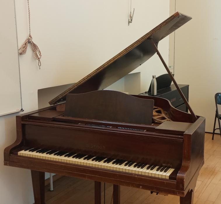 Brauner Blüthner-Stutzflügel ca. 70 Jahre alt, hält die Stimmung gut, kleine Risse im Resonanzboden ohne klangliche Auswirkung, Gebrauchsspuren am Furnier, Preis VB