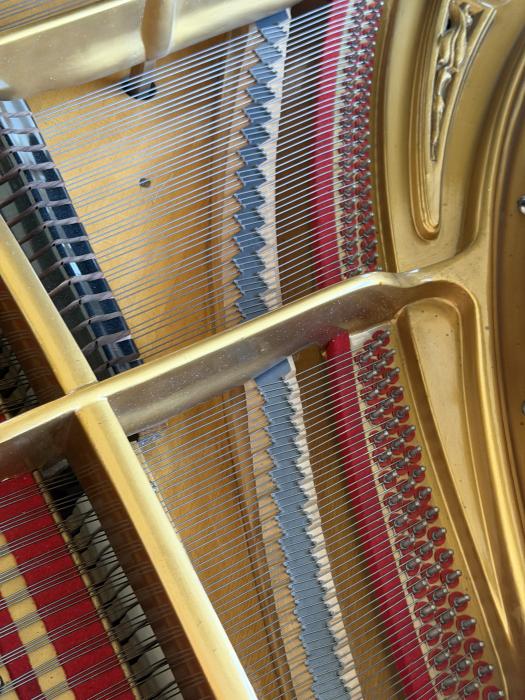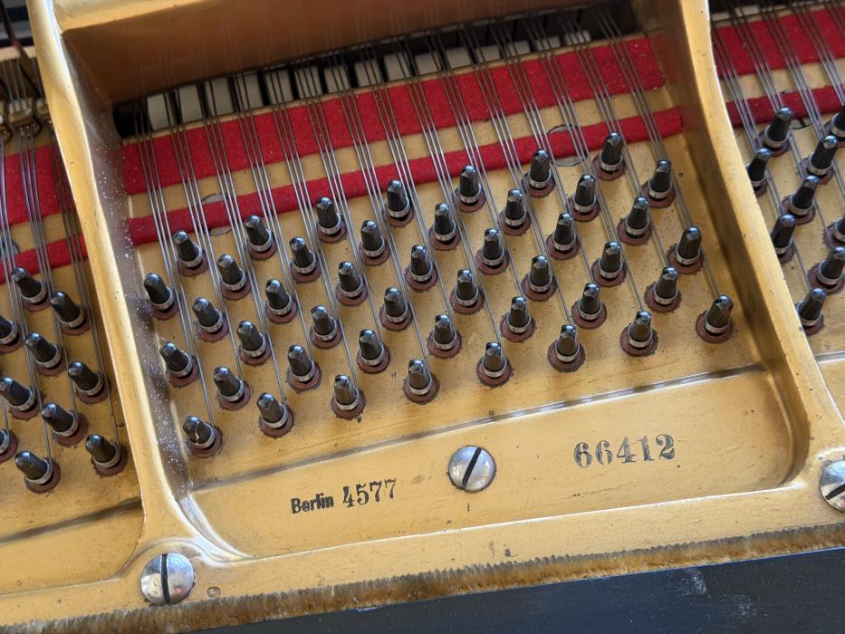 Originaler schwarzer Schellack. Das Gehäuse zeigt eine authentische Patina, die dem Alter von über 110 Jahren entspricht. Es ist nichts "kaputt", aber der Flügel trägt seine Geschichte mit Stolz – was sich in einem sehr attraktiven Preis-Leistungs-Verhältnis widerspiegelt.
