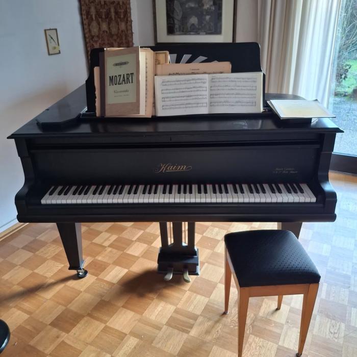 Kleiner Kaim-Flügel von 1928, schwarz, 170 cm. In den 90' iger Jahren für 14000 DM restauriert, Nachweis vorhanden, guter Zustand, regelmäßig gespielt.Nur Selbstabholung. Flügel steht ebenerdig.