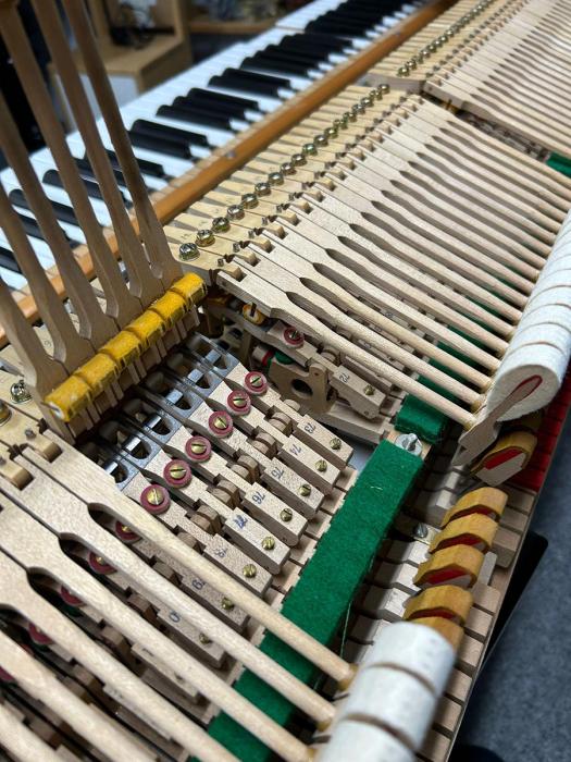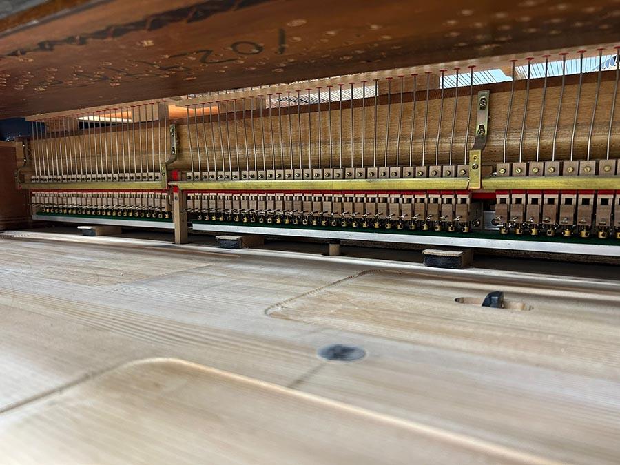 In unserer Fachwerkstatt wurde die Mechanik reguliert und die Tasten wurden gerade gelegt, die Tastenbeläge poliert. Das Gehäuse und die Messingteile wurden komplett aufpoliert.