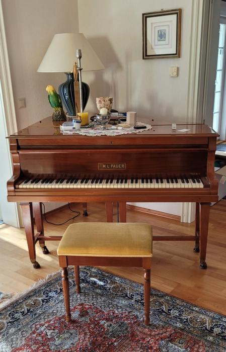In honigfarbenem Lack ist es zudem ein wunderschönes dekoratives Instrument. Es muss nachgesehen und gestimmt werden, nachdem es geraume Zeit nicht bespielt wurde, wurde aber stets sorgsam behandelt und weist nur geringe Gebrauchsspuren auf, wenn überhaupt.