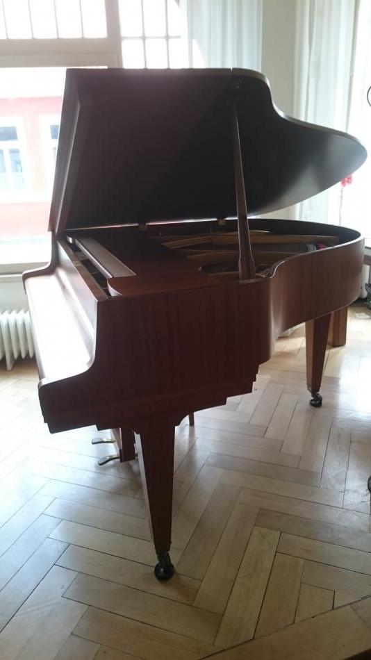 Laut unseren Unterlagen handelt es sich bei dem Instrument mit der Seriennr. 77.990 um einen Flügel, Mod. 150 E in Nussbaum satiniert, Länge 150. Gefertigt wurde das Instrument 1965 in Braunschweig.Besonderheit ElfenbeinKlaviatur.