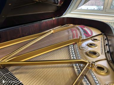 Wunderbarer Steinway Flügel, innen wie außen liebevoll und detailgetreu in unserer Meisterwerkstatt nach allen Regeln der Kunst überholt. Von innen strahlt der Flügel noch die alte Aura seines Erbauungsjahres 1918 aus: Feinstes Palisander Innenfurnier gepaart mit der filigran ausgearbeiteten Gussplatte. Ansonsten ist der Flügel nahezu baugleich mit einem heutigen Flügel. Er spielt sich auch wie ein neuer Flügel, denn er erhielt eine komplett neue Steinway Mechanik und eine neue Kluge Klaviatur. Die Akustik wurde fachgerecht überholt, die Oberfläche kompromisslos erneuert, samt neuer Rollen, Schriftzug und...