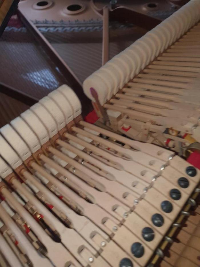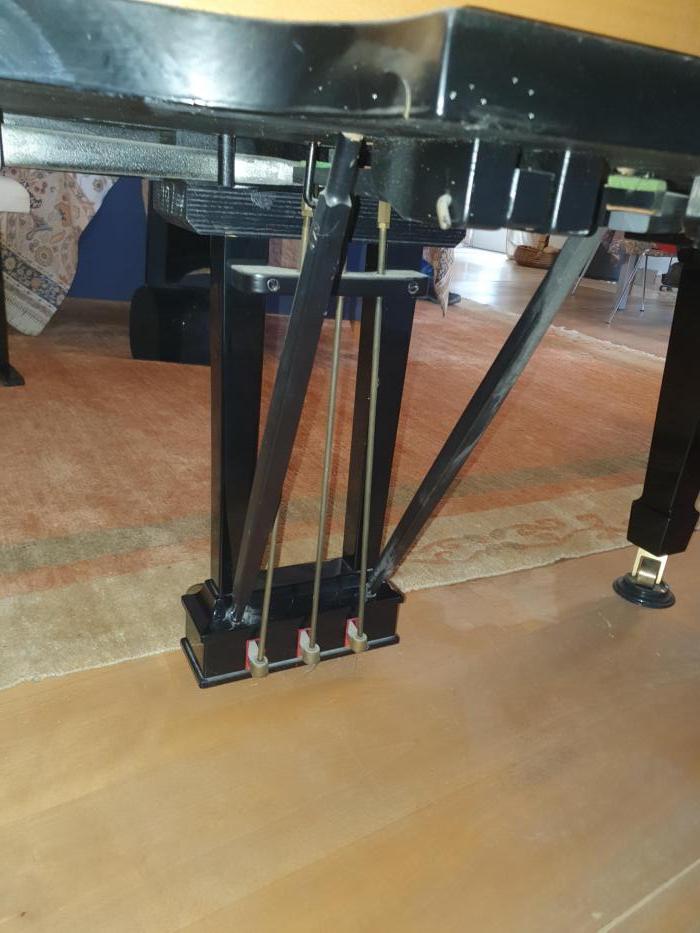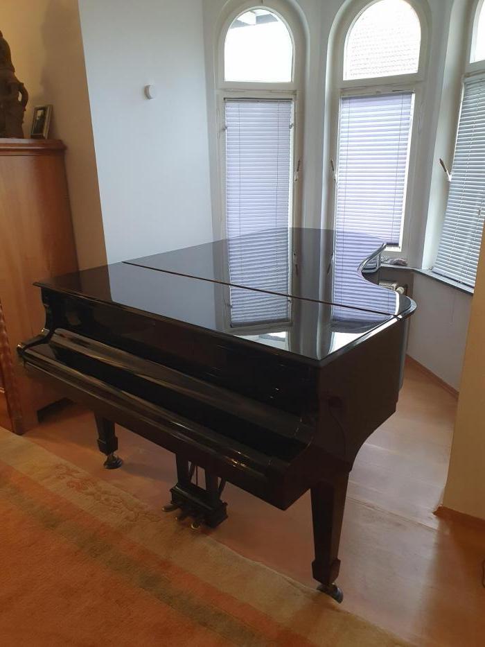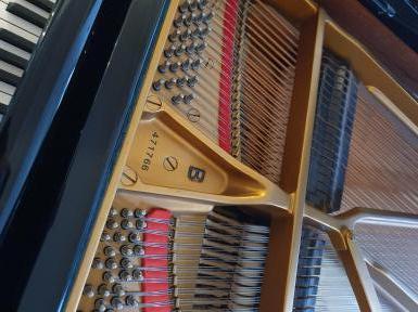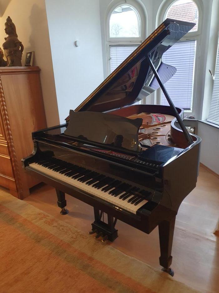 Der Flügel wurde mit einem Finish Klavierlack schwarz poliert auf Polyesterbasis lackiert. Die Lackierung ist original und bis auf kleinere, sehr feine Kratzer und 2 Fehlstellen wie einem Lackabplatzer der Größe Durchmesser 2mm an der Innenkante des Beine vorne links und eine Druckstelle von ca.5mm Durchmesser auf dem Hinterdeckel Mitte rechts in einem sehr guten Zustand. Die erwähnten Kratzer würden sich in einer geeigneten...