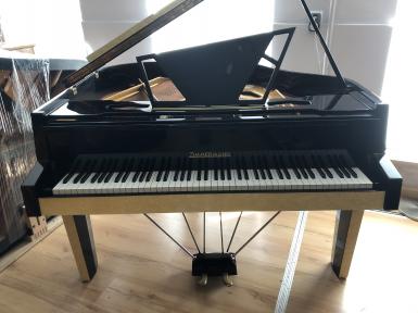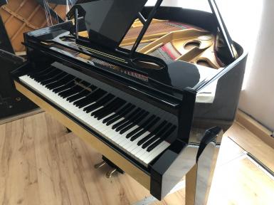 Sicherlich handelt es sich hierbei um ein äußerst seltenes Modell oder eventuell sogar um ein Einzelstück. Mit seinen klaren Formen und Designelementen des Art Deco wird dieser Flügel zum absoluten Blickfang in ihrem Wohnzimmer. Der Korpus ist in schwarzem Klavierlack lackiert, einige Flächen sind mit gelber Schildpatt - Optik gestaltet, wie man es sonst eher von Akkordeon - Gehäusen kennt.