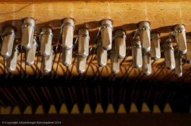 11. Nach dem „Einpauken der Maschine“, durch kraftvolles Anschlagen jeder Taste währendessen der Hammer festgehalten wird, muss die Regulierung zwischendurch und am Ende immer wieder kontrolliert werden, um ggfs. alle Einstellungen auf das erforderliche Maß zu bringen. Die Stoßzunge darf beim „Durchpauken“ nicht „durchrutschen“, sollte aber beim Flügel soweit wie möglich nach vorne gestellt werden, um ein übermäßiges „Gnubbeln“, d.h. Reibungsgefühl beim Abnicken, zu vermeiden. Beim Pianissimospiel sollte man keine unnötigen Widerstände überwinden müssen, daher sollten die Stoßzungen und Hammerröllchen mit Graffitpulver und Stiften gleitfähig gemacht werden.