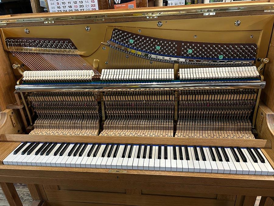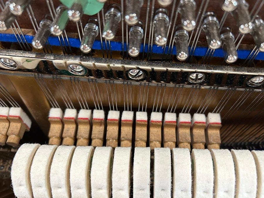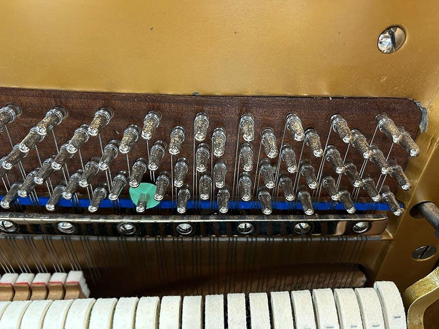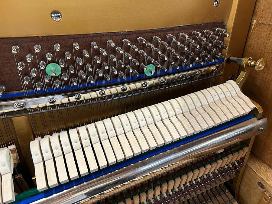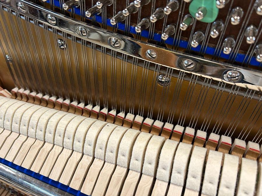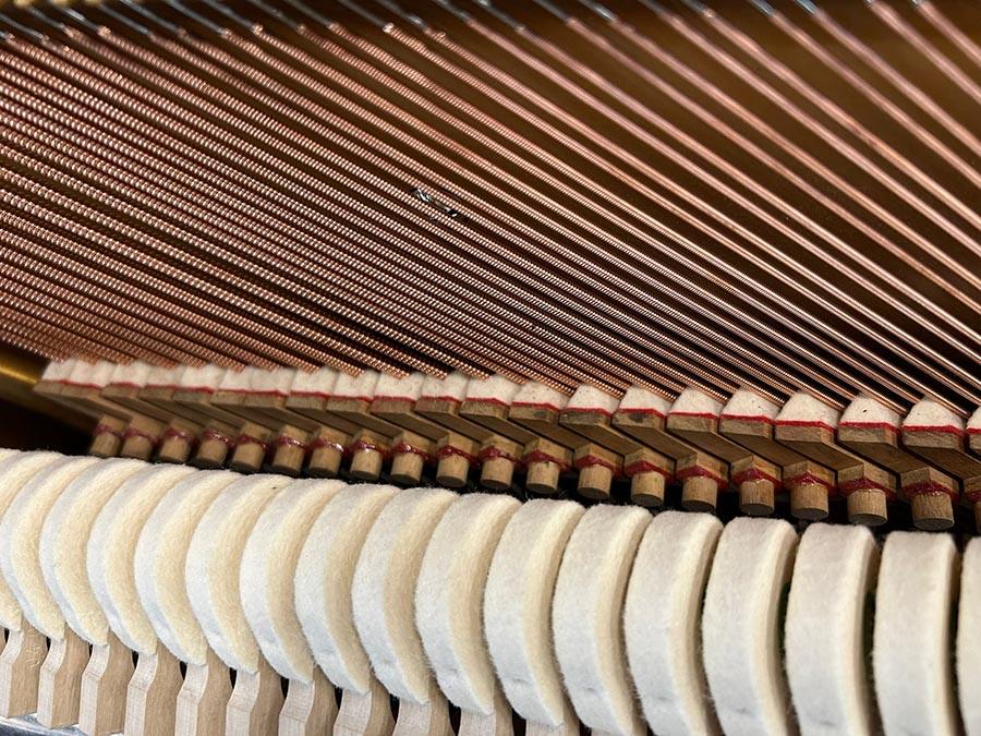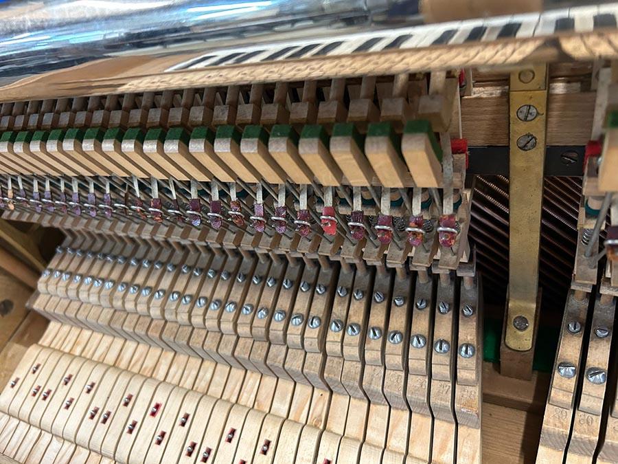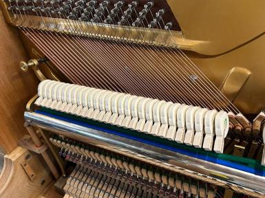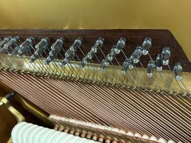 Das Klavier wurde in unserer Fachwerkstatt sorgfältig und umfassend überarbeitet. Dazu gehörte die Überholung der akustischen Anlage mit dem Austausch des Stimmstocks. Der Resonanzboden wurde ausgespänt und die Gussplatte neu lackiert.