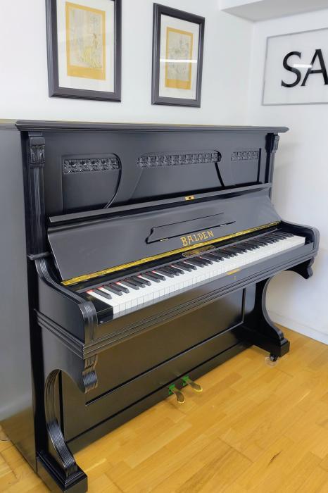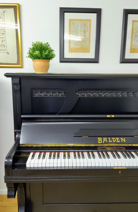 Dieses stilvolle Balden Piano aus dem Hause Baldur wurde ca. 1900 erbaut und nun komplett überholt.Alles ist erneuert, die Klanganlage und das Spielwerk sind überholt und in einem Top Zustand. Die ehemals schwarze Schellack-Oberfläche wurde schwarz matt neu lackiert.