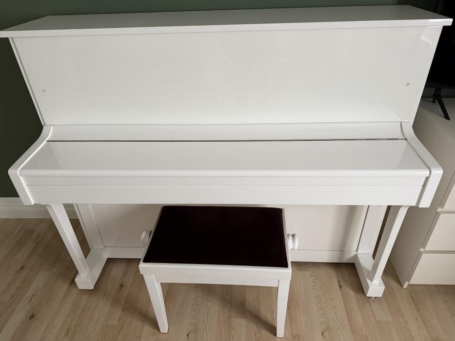 Klavier von Balth. Döll. Modell Classic in der Ausführung Chrom. Weiß poliert. Inklusive Klavierhocker. Baujahr 2011