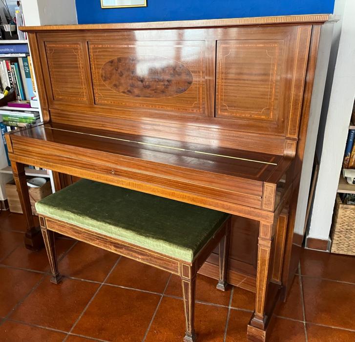 Wegen Umzug müssen wir unser Bechstein Klavier Empire Modell 8 aus Mahagoni verkaufen. Das Klavier von 1926 wurde 2020 fachgerecht überholt. Es wurden die Hammerköpfe, Saiten und Klavierfilze erneuert, 8 Tasten ersetzt und der Rahmen gerichtet.Rasten, Stimmstock, Saiten, Stimmhaltung, Mechanik und Gehäuse wurden mit sehr gut bewertet.