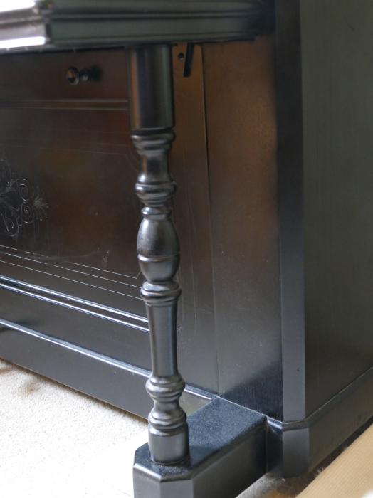 Es besitzt Tasten aus Elfenbein und sehr kunstvolle Verzierungen im Frontbereich.