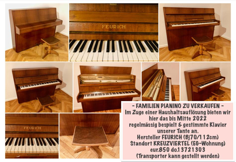 aus der Haushaltsauflösung meiner verstorbenen Tante biete ich hier das noch bis Sept. 2022regelmässig bespielt und gestimmte Pianino der Marke FEURICH an (Bj70)