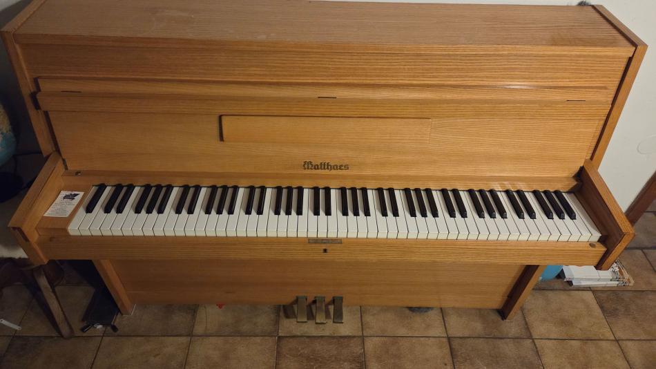 Bei dem Instrument handelt es sich um ein Klavier der Firma Matthaes aus dem Jahre 1961 mit der Seriennummer 38521.Es handelt sich um ein Silentklavier in der Farbe Esche oder Eiche.
