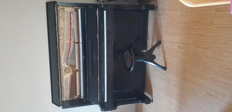 Orginal erhaltenes Klavier mit Hocker. Wurde 2010 gefunden und nach Begutachtung vom Klavierbauer wurde der Resonanzboden, eine Elfenbeintaste und die Goldfarbe erneuert.Breite 156 cm