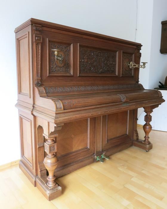 Nußbaum, Jugendstil- und Gründerzeitelemente, 85 Tasten, Höhe 135 x Breite 150 x Tiefe 70 cm, gebaut bei Julius Hansen, Flensburg, Baujahr ca. 1900Das Klavier wurde 2010 für € 6.500,- komplett überholt, Innenleben komplett restauriert, Belege und natürlich viele Detailfotos auf Anfrage. Tastatur ist original. Schöner Klang, äußerst dekorativ. Nichtraucherhaushalt. Zustand 1a. Einen schönen Klavierhocker gibts dazu, wenn gewünscht.