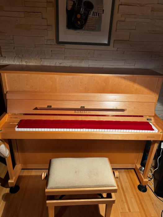 Es handelt sich hierbei um ein kaum genutztes 118 K Klavier von Rönisch. Es wurde regelmäßig durch Experten gestimmt und besteht aus Ahorn und unterliegt der Renner-Mechanik.Die Maße des Klaviers: Höhe 118cm, Breite 153cm, Tiefe 62cm. Es wiegt 210kg und zeichnet sich durch 7 1/4 Oktaven aus.