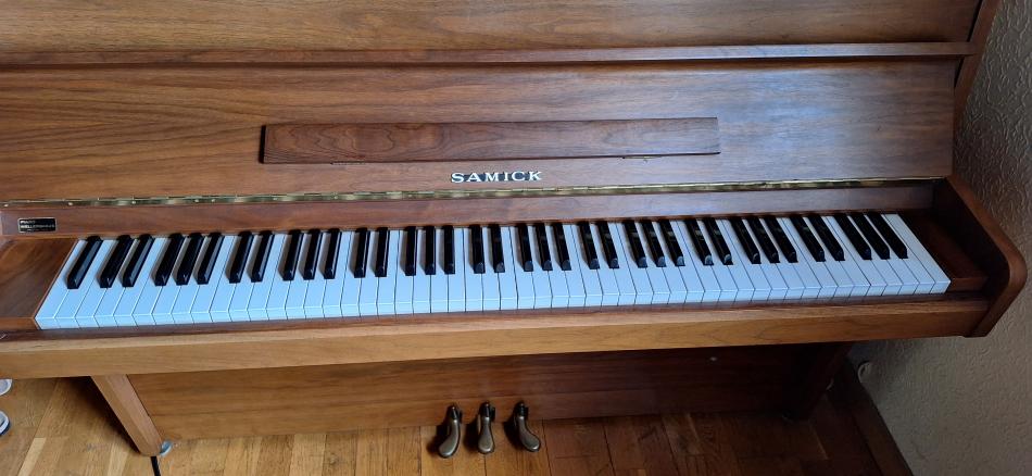 Gebrauchtes Klavier der Firma Samick UP-110 im guten Zustand. Das Alter des Klavieres ist leider nicht bekannt. Die Seriennummer lautet 8297779. Die Farbe ist Walnussdunkel sataniert.Der Preis ist frei verhandelbar. Das Klavier muss abgeholt werden.
