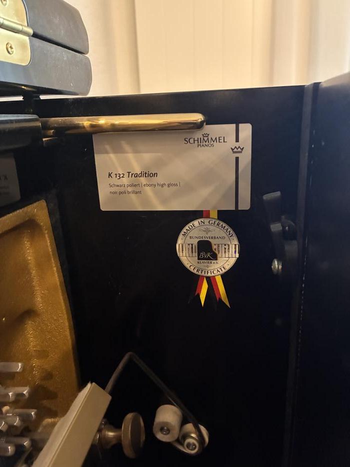 Zum Verkauf steht ein hochwertiges Schimmel K 132 Tradition Konzertklavier in Schwarz Hochglanz (Polished Black), Baujahr 2017. Das Instrument befindet sich in sehr gutem Zustand und wurde stets regelmässig gewartet und gestimmt. Das K 132 gehört zur deutschen Konzertserie von Schimmel und überzeugt durch kraftvollen, klaren Klang sowie professionelle Spielart - ideal für ambitionierte Pianisten, Musikschulen oder anspruchsvolle Privathaushalte. Besichtigung und Probespiel nach Vereinbarung möglich. Transport durch Käufer oder nach Absprache.- regelmässige Wartung