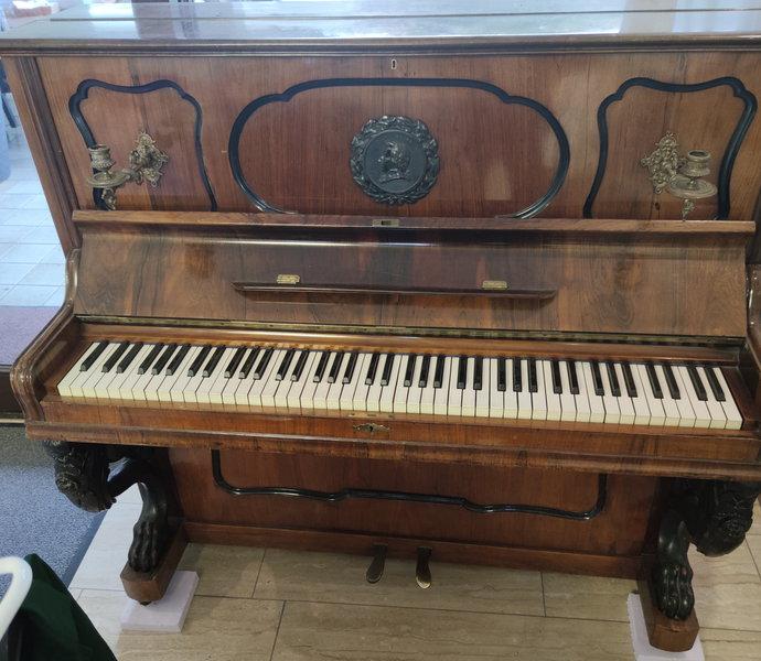 Ein sehr altes, aber gut erhaltenes Klavier - mit Original-Ornamenten und Kerzenhaltern. Der Klang ist gut, es wurde vor ca. 20 Jahren teilweise restauriert. Es stammt von den Klavierbauern Schmidt & Suppe aus Zeitz (19. Jahrhundert) und ist eine echte Antiquität - immer noch gut spielbar. Lediglich 4 Tasten haben eine gerissene Auflage.Breite: 139,5 cm / Höhe: 126 cm / Tiefe: 67,5 cm
