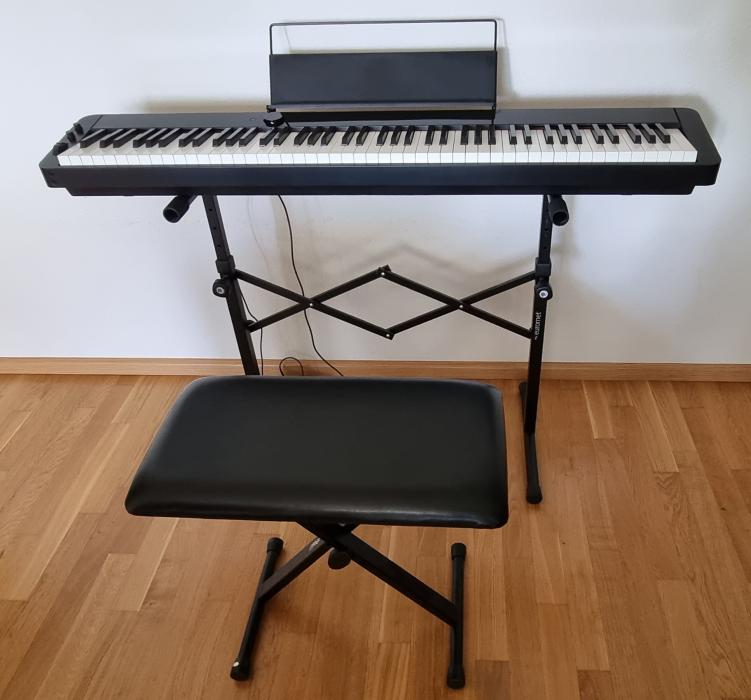 Zubehör: Euromet Keyboard Ständer (klappbar und höhenverstellbar), Klavierhocker der Marke Stagg (klappbar und höhenverstellbar), Casio Fußpedal, Notenständer zum Anbringen am Klavier, Anleitung