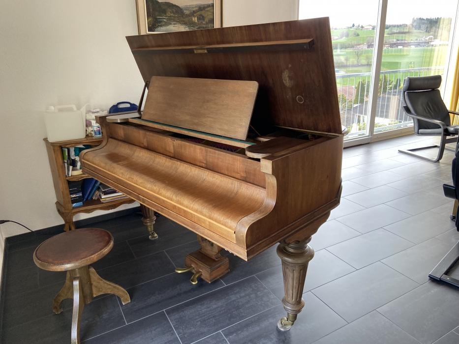 Antiker Flügel der Marke Gaveau, Ende des 19. Jahrhunderts, ist regelmässig gestimmt und vor ca. 10 Jahren total revidiert worden, schönes Gehäuse aus Nussbaum mit kleineren Mängeln, Elfenbeintastatur, eingebautes Befeuchtungssystem Dampp Chaser, mit gedrehten und geschnitzten Beinen, Grösse b x l x h 150 x 180 x 100 cmKann ebenerdig zu einem Fahrzeug getragen/transportiert werden. Muss abgeholt werden.