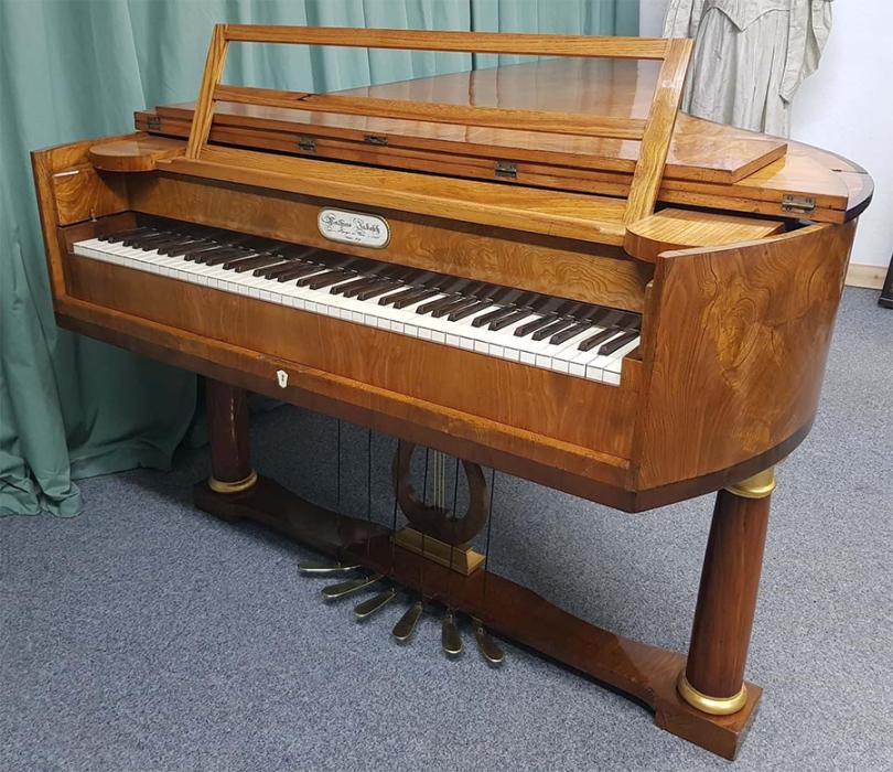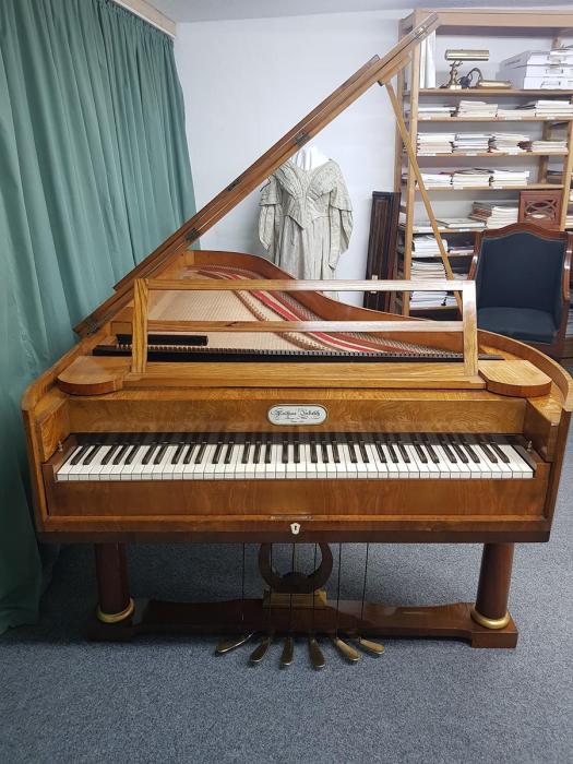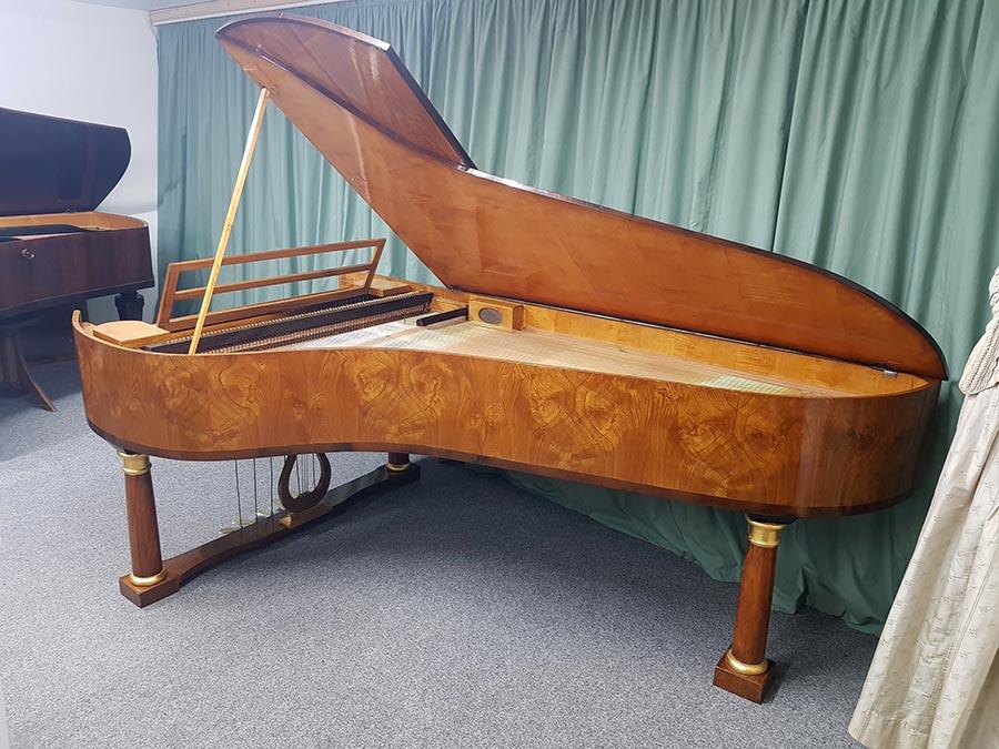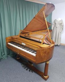 Länge 235cm, Oberfläche Ulme Maser, Tonumfang 6 ½ Oktaven (78 Tasten, C1 bis f4), Tastenbelag aus Knochen, Prellzugenmechanik (Wiener Mechanik), Tonhöhe 440 Hz, 6 Pedal e: Una Corda (Verschiebung), Fagottzug, Forte (Dämpfungsaufhebung), Moderator (2 Pedale mit gleicher Funktion), Janitscharenzug