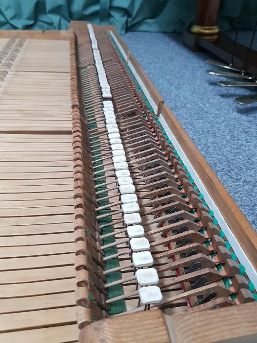 Die Tasten und der Klaviaturrahmen wurden gereinigt. Die weißen Tastenbeläge wurden geschliffen und poliert, die schwarzen Tasten poliert.