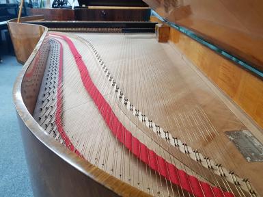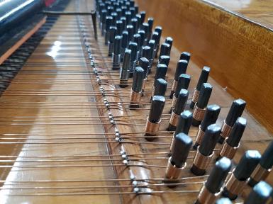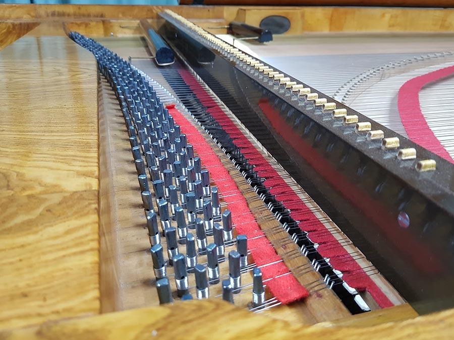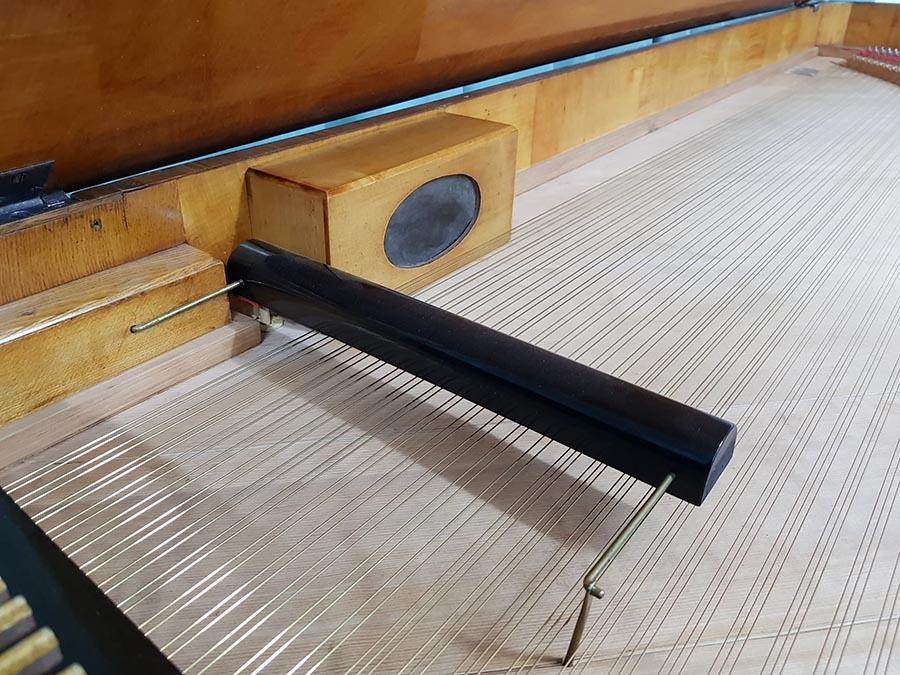 Wir haben die Mensur basierend auf den originalen Saiten unter Berücksichtigung der maximalen Belastung neu berechnet. Der Flügel wurde mit historisch nachgefertigtem Saitenmaterial (Messing- und Bronzedraht im Bass, Eisendraht in Mittellage und Diskant) und unter Verwendung der originalen Stimmwirbel neu besaitet. Die Saiten wurden gleichmäßig und schrittweise auf die volle Spannung gebracht, um einseitigen Verzug des Instruments zu verhindern.