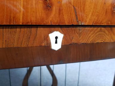 Das beschädigte hintere Deckelscharnier wurde geschweißt. Die fehlende Schlüsselbuchse wurde neu, aus Knochen, angefertigt.