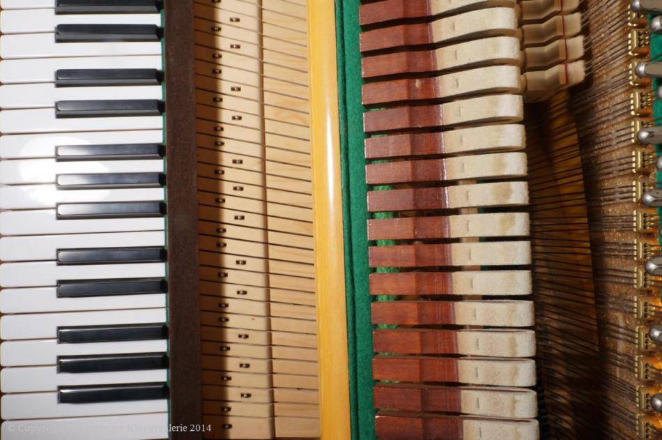 12. Das umfangreiche Thema des optimalen Tasten- Auf- /Abgewichts, kann hier unmöglich geschildert werden, wird aber bei jedem Instrument von mir geprüft und wenn nötig, durch herrausnehmen oder hinzufügen von Bleigewichten, optimiert. In manchen Fällen ist sogar das Versetzen der Piloten oder (meistens) Vorbiegen derselben (beim Klavier) eine sehr gute Lösung, um wenn nötig eine leichtere Spielart zu erlangen – natürlich muss die Steigung entsprechend geändert werden.