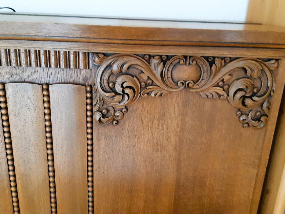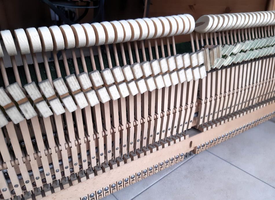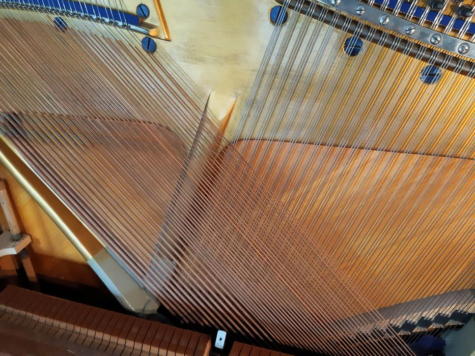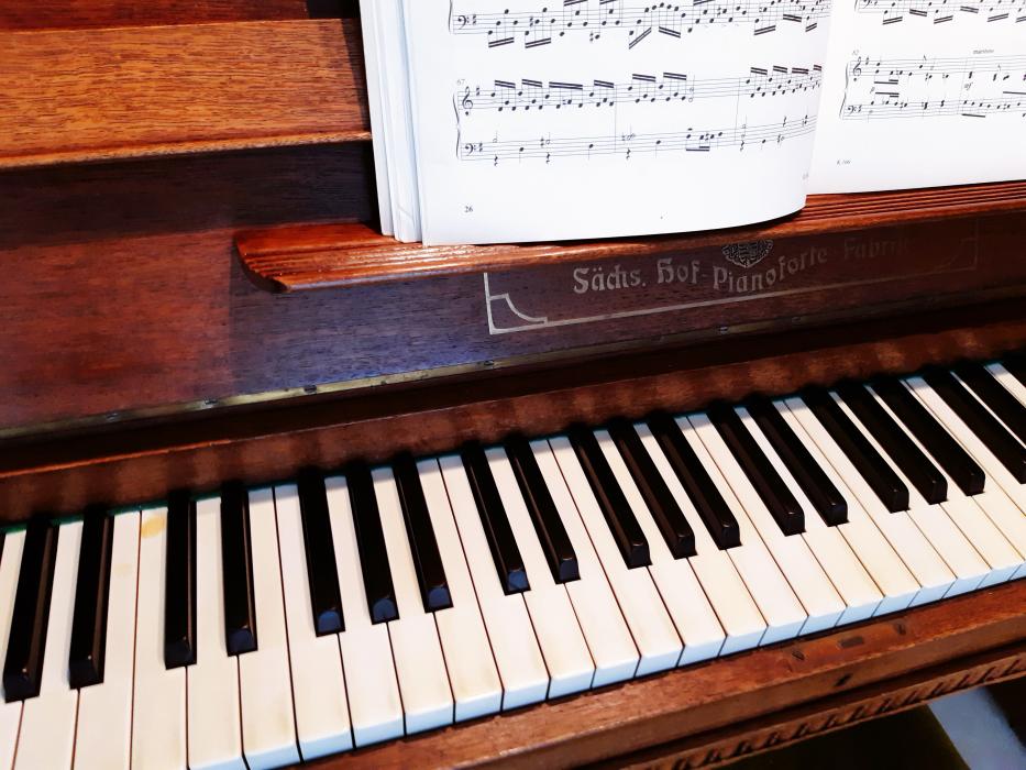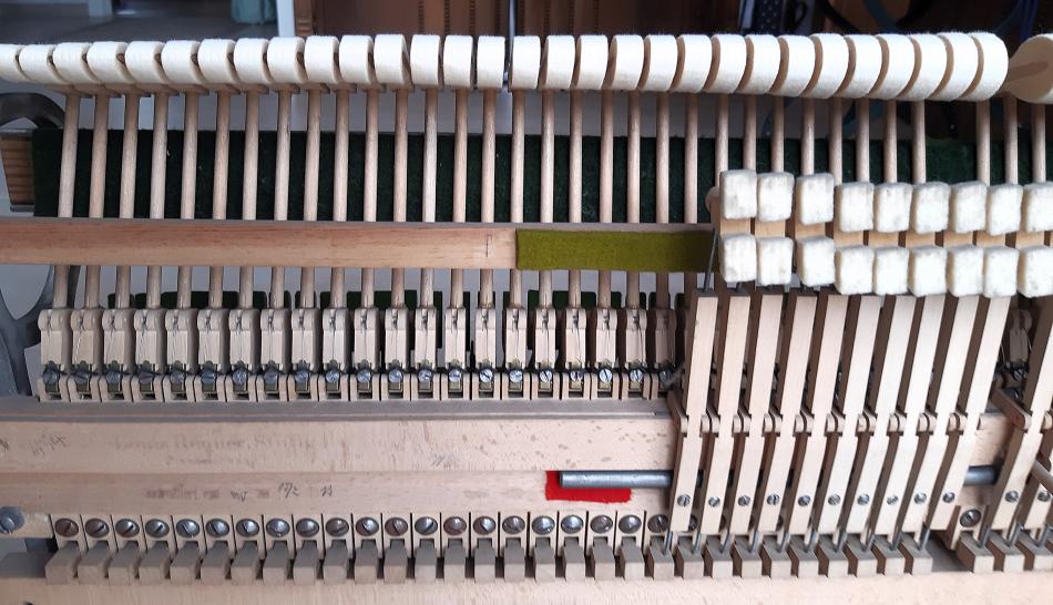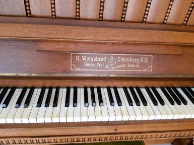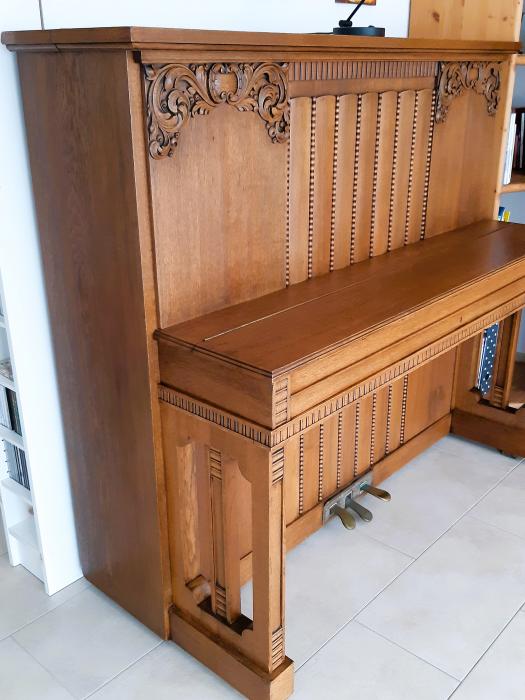 Filze, Stimmung gepflegt; matte Holzoberfläche v. Restaurator, Massivholz 'Eiche' hell, Saitenboden kpl. Stahl, kein Rost, Tasten kpl. mit Elfenbein belegt, teilw. Applikationen auf der Oberfläche, Gebrauch f. Klassische Musik. Gebaut ca. 1925.