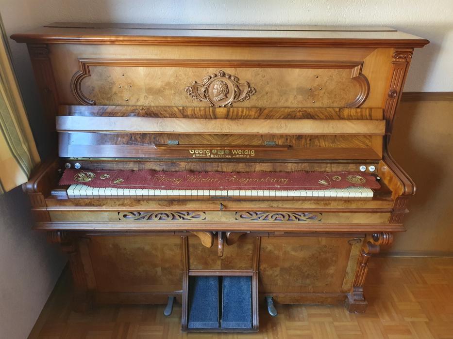 Gut erhaltenes Klavierharmonium von Georg Weidig, Großh. Sächs. Hof-Pianofortefabrikant, Regensburg Seriennummer 15543.Das Instrument wurde in den 1990er Jahren restauriert und ca. 2011 gestimmt.