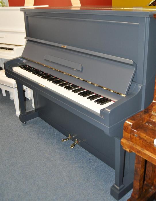 neu grau satiniert lackiert, akustische Anlage komplett überholt (ohne Stimmstock), neue Stimmnägel, Hammerköpfe abgezogen, Mechanik reguliert, neue Dämpferfilze, neue Saiten (Bass und Diskant), Tastengarnierungen neu, Tasten poliert