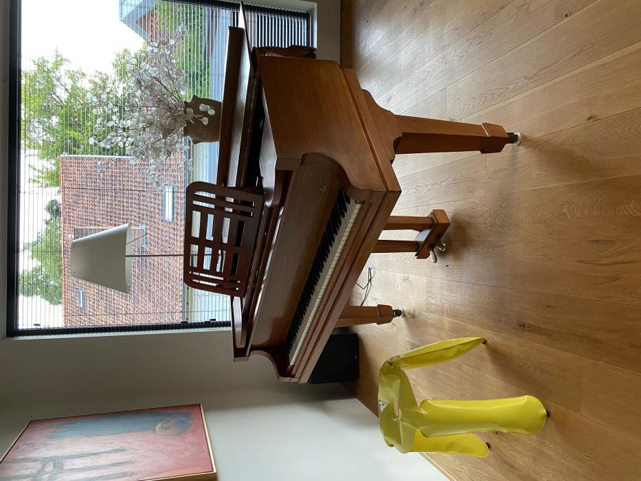 Sehr solider deutscher Flügel der Marke Steinberg, Baujahr 1920. Es handelt sich um einen sogenannten „Babyflügel“. Etwas kleinere Größe und daher leicht in einen Innenraum zu passen (140 x 155 cm). Von uns Anfang der 90er Jahre als überarbeiteter Flügel bei Cristofori in Amsterdam gekauft. Ein tiefer, kräftiger Klang, immer gut gestimmt, erfordert aber noch Aufmerksamkeit bei der Feineinstellung (persönliche Vorlieben sind hier auch wichtig) und kosmetisch (Wasserflecken können ausgebessert werden, und einige Elfenbeintasten müssen bearbeittet werden).Über die Marke Steinberg; siehe Wikipedia.