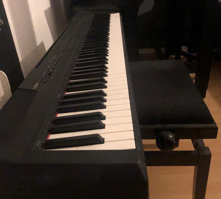 Ich verkaufe mein YAMAHA P-105B Digital Stage Piano mit Holzständer, Sitzbank, Sustain-Pedal und Tragetasche.