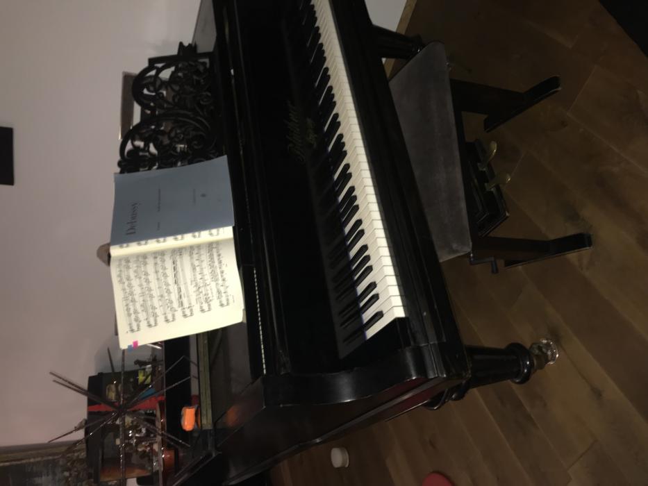 Der Blüthner Flügel von 1898 mit einer Länge von 210 cm wurde Im Jahr 2009 teilrestauriert und besticht durch seinen Klang. Das Instrument wurde zerlegt und gereinigt. Der Resonazuboden wurde ausgespänt geschliffen und lackiert.Die Stege wurden überarbeitet. Die Platte wurde neu garniert und auf Druck eingebaut. Neue Stahl und Bassaiten wurden aufgezogen, die Wirbel erneuert, hochgezogen und das Instrument zusammengebaut. Die Mechanik und Klaviatur wurde ausgebaut, sämtl Achsen gangbar gemacht und teilweise ausgeachst. . Ein Hammerstiel (special Blüthner ) wurde erneuert. Hämmer wurden abgezogen und auf Cohr gefeilt, Sämtliche Schrauben angezogen, Klaviaturstifte poliert und...