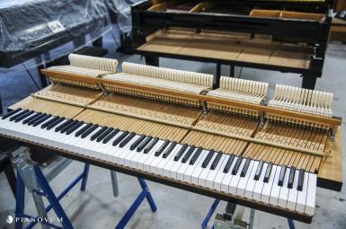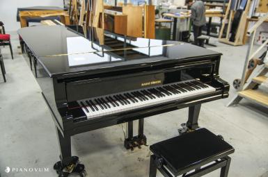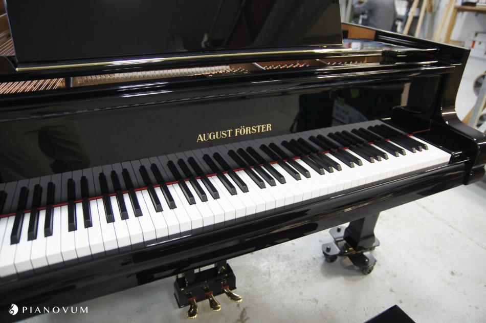Gebaut wurde der Flügel 1964 in der Manufaktur Förster im sächsischen Löbau. In einem langwierigen und teilschrittigen Prozess haben wir das Instrument komplett neu aufgebaut. Um die Spielart zu verbessern haben wir die einstmalige Mechanik komplett durch neue Renner Mechanikteile ersetzt, der mechanische Aufbau entspricht jetzt der Renner Geometrie und sorgt für ein sehr gleichmäßiges und leichtläufiges Spiel. Die Klaviatur wurde neu aufgebaut mit neuen Tharan Belägen (Standard...