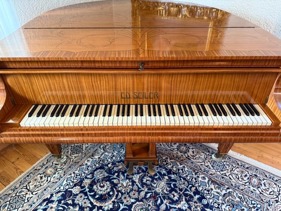Dekorativer Stutzflügel für Liebhaber aus Nussbaum mit Einlegearbeiten, gut und liebevoll gepflegt. Wegen Umzug in kleinere Umgebung Verkauf unumgänglich. EU Bescheinigung für Elfenbeintastatur vorliegend.