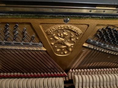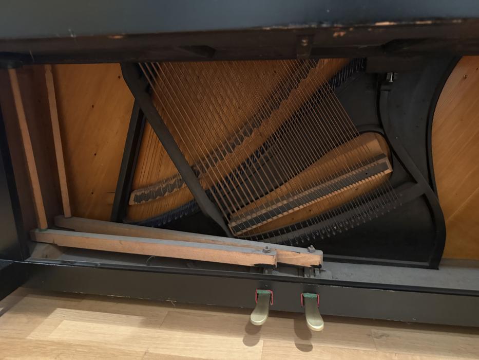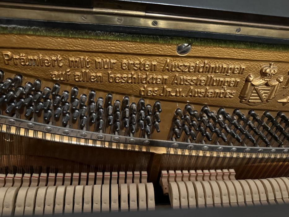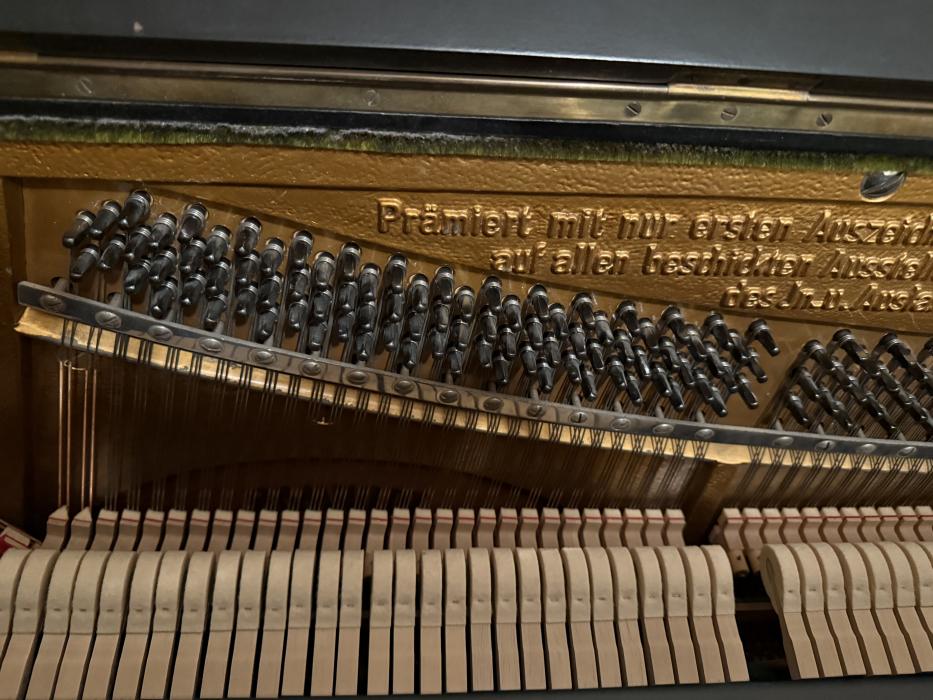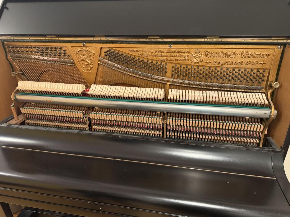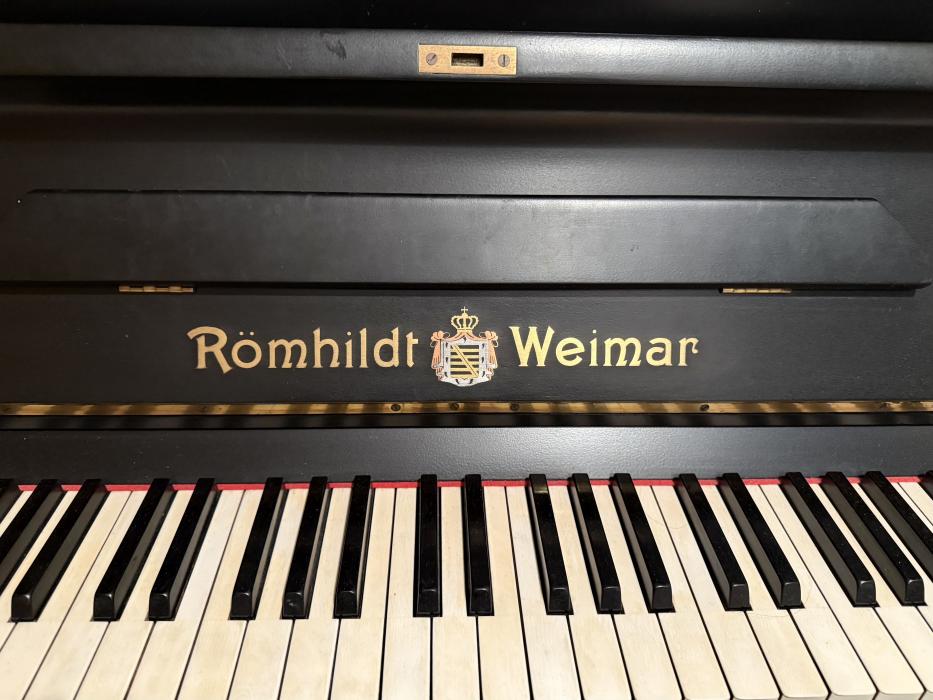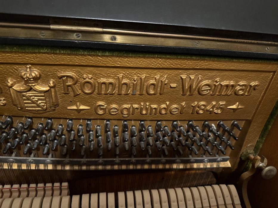 Eine Besonderheit: ein Klavier der Marke Römhildt Weimar, laut Seriennummer 20248 aus dem Jahr 1930. Das Klavier ist in sehr gutem Zustand und wurde schon mal überholt: technisch, laut Gutachten vom 13.09. 2025, einwandfrei! Kleine Regulierungsarbeiten an der Mechanik sind erfolgt, neue Hammerköpfe, Dämpfung und Stimmwirbel. Stimmung hält, Resonanzboden ist gut.Das nachlackierte Gehäuse (schwarz-seidenmatter Lack) weist geringe Gebrauchsspuren auf.