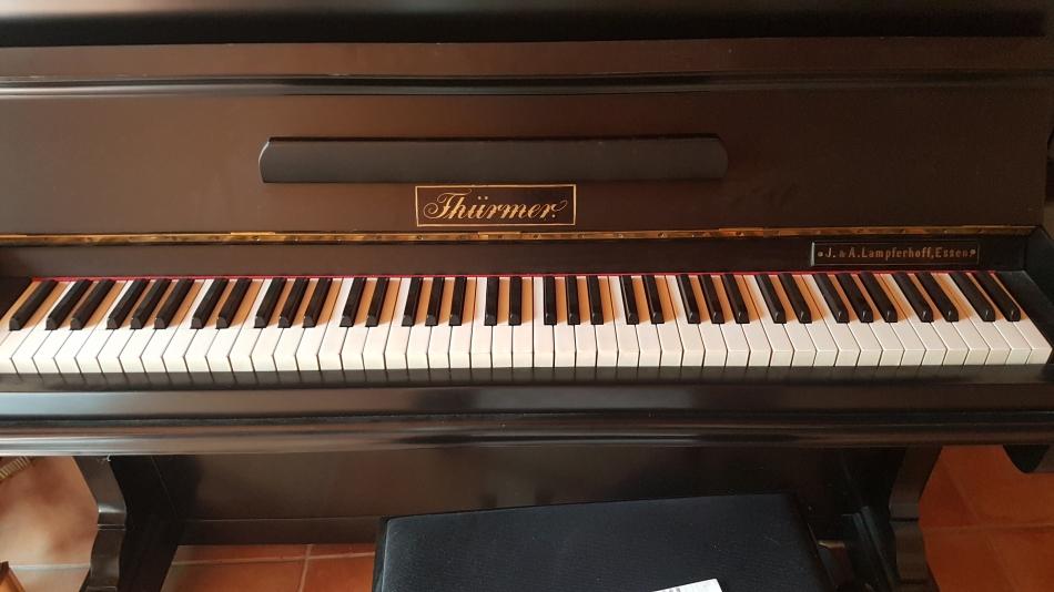 Wir verkaufen unser antikes Thürmer Klavier, Seriennummer 16444, Baujahr vermutlich 1895.2006 haben wir es restaurieren lassen, Rechnung über 7000 € liegt vor. Seit 2014 kaum bespielt und nicht mehr gestimmt, ansonsten guter, bespielbarer Zustand.
