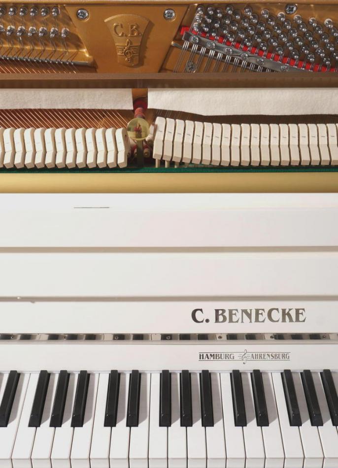 Neues Klavier! Die C. Benecke Klaviermechaniken, sind wie ihr berühmtes Vorbild, aus feinem, gut abgelagertem, massivem Weissbuchenholz französischer Herkunft, nach deutschem Vorbild, in traditioneller Weise gefertigt.Die Hammerkopffilze und sonstige Tücher und Filze entsprechen den bis dato verfügbaren guten, bis sehr guten Qualitäten. Die komplette Ausarbeitung, Endregulierung und Intonation in unseren Ahrensburger Werkstätten machen dieses Klavier, auch bei professionellen Musikern, zu einem beliebten Instrument ,nicht zuletzt wegen seiner guten Stimmhaltung, der ausgewogenen und repetierfreudigen Spielart, sowie des voluminösen Klanges. Das Seitenmaterial wird von der Firma Röslau aus Deutschland geliefert.