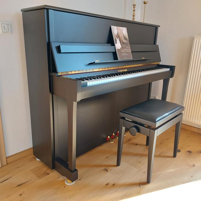 Hiermit biete ich ein sehr gepflegtes und sehr gut erhaltenes Klavier der Marke Hoffmann WH 120, made by C. Bechstein EuropeEs wurde im Januar, von einem Fachmann, in Schwarz Matt umlackiert.