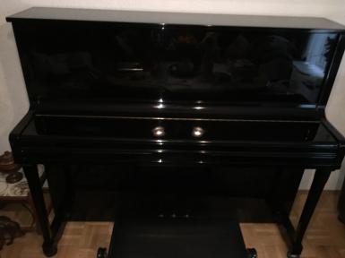 Klug & Sperl Piano, schwarz poliert. Baujahr 1997, 122 cm hoch (geschlossen), hergestellt in Deutschland.